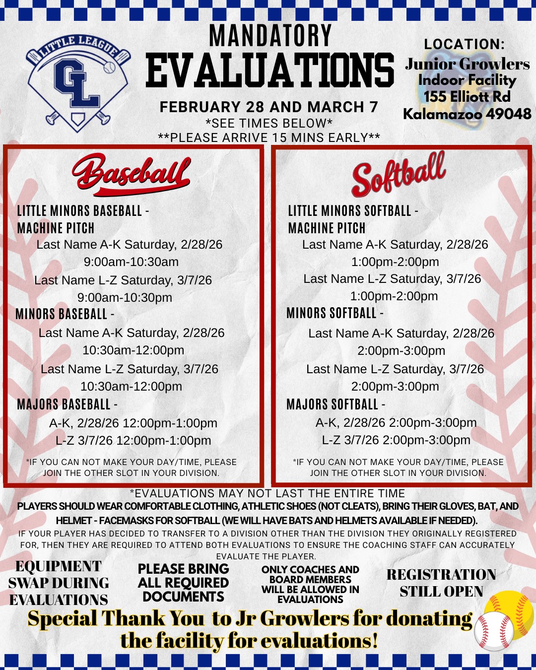 - Players who are registered in a Baseball or Softball program (age 7 & up) Little Minors division and higher must attend the player evaluations. All registered players will be drafted to a team and evaluations are used to help balance the teams and simply gauge your player's skill level.